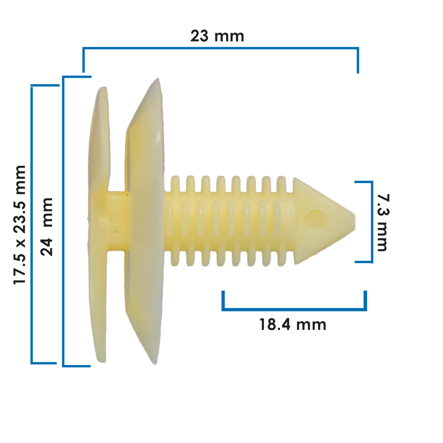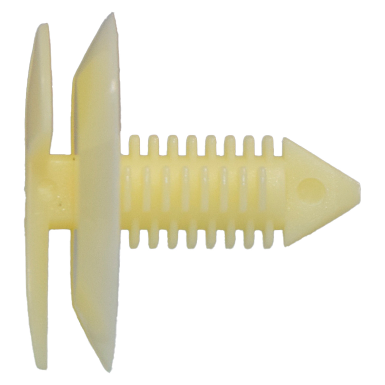 Pija de tapicería plástica para Chevrolet S‑10, fabricada en nylon blanco de alta resistencia. Diseñada para fijar paneles, molduras y forros interiores con ajuste firme y seguro. Compatible con aplicaciones automotrices GM y Chrysler.