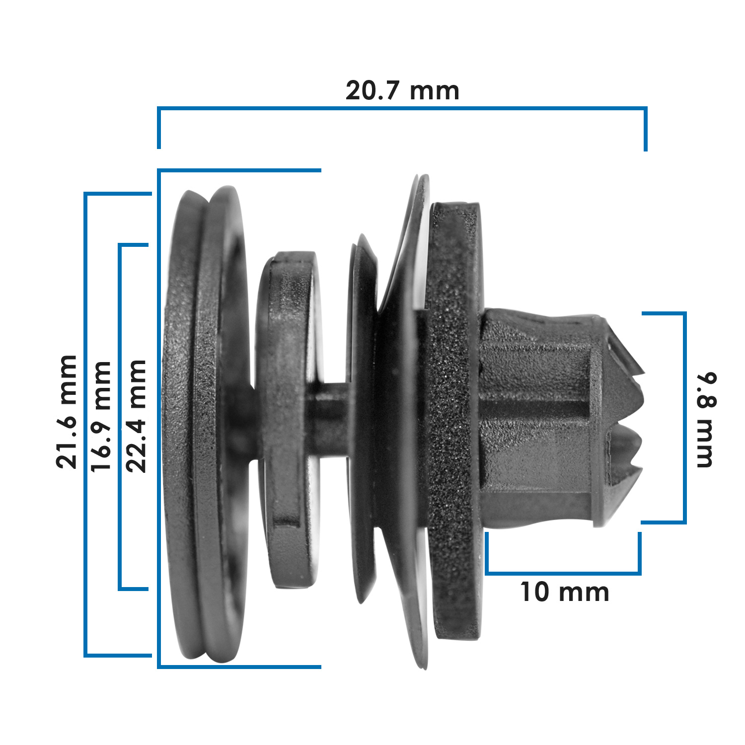 Pija de tapicería compatible con Volkswagen Jetta, Golf y SEAT Ibiza. Diseñada para fijar paneles interiores, forros de puertas y molduras. Fabricada en plástico automotriz resistente, garantiza una sujeción firme y duradera.