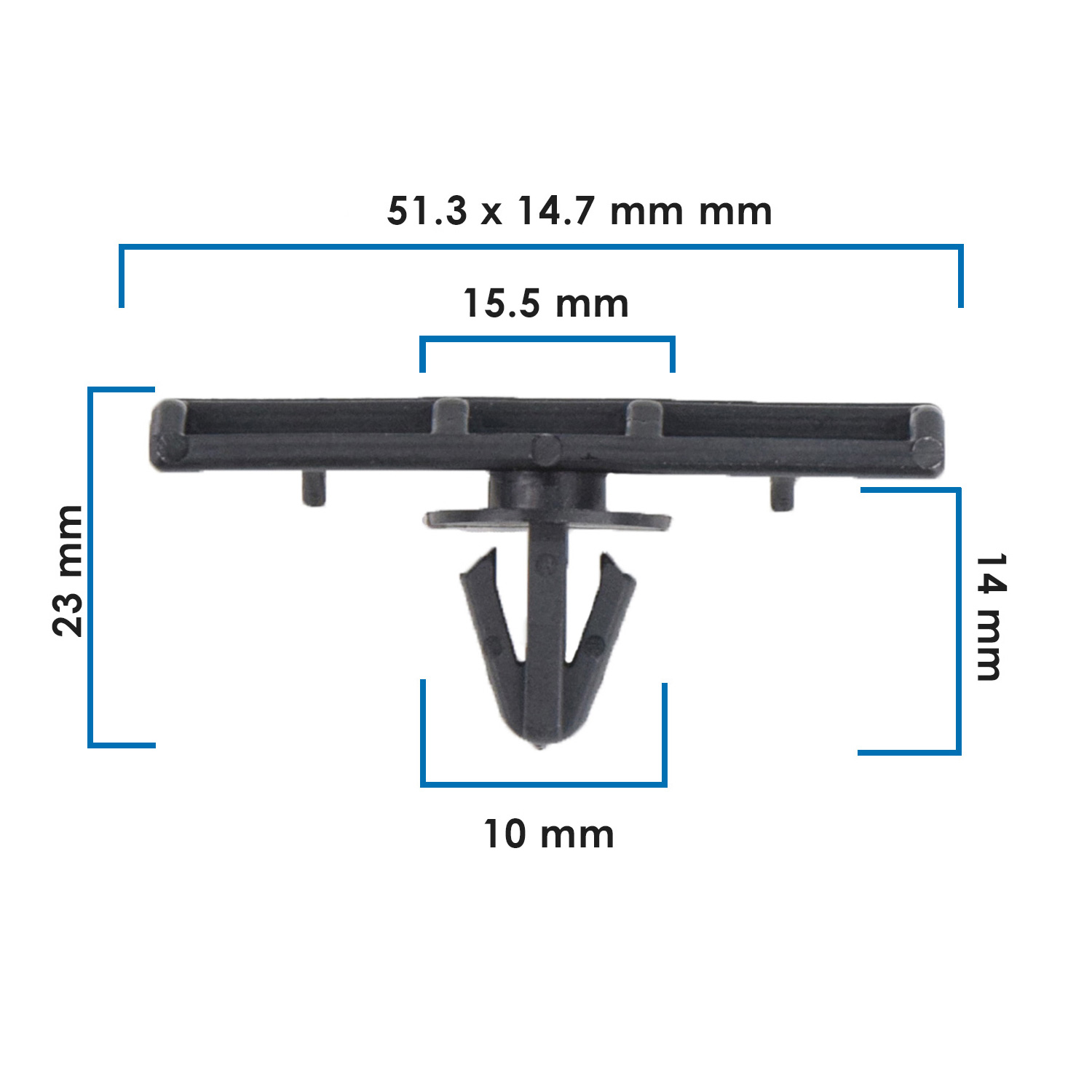 Grapa universal de moldura para Ford Explorer, hecha en nylon negro de alta resistencia. Su diseño universal encaja en orificios de 10 mm, ideal para fijación profesional de molduras laterales en modelos Explorer y otros vehículos.