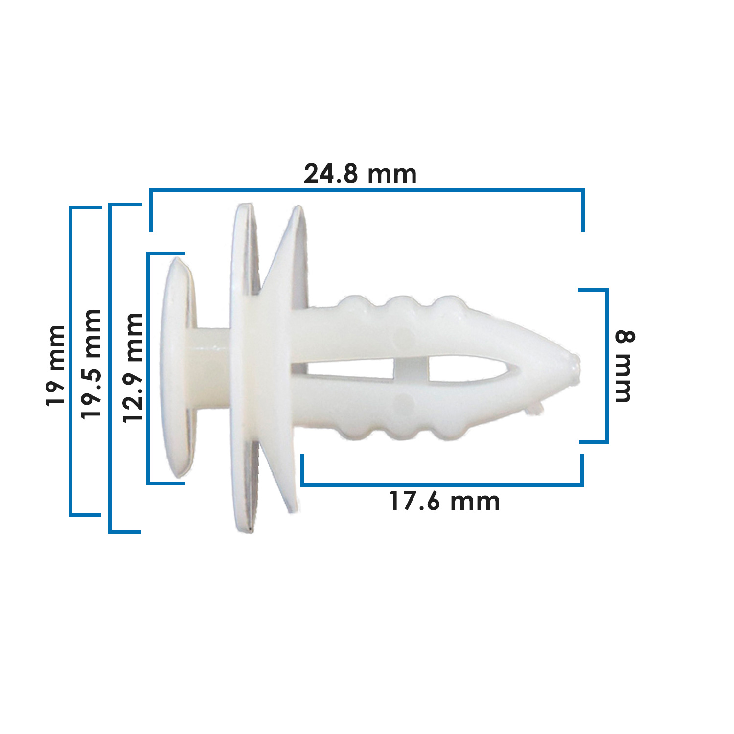 Grapa tapicería Ford (Granada/Mustang/Town Car). Nylon blanco 8 mm. Ajuste seguro y duradero.