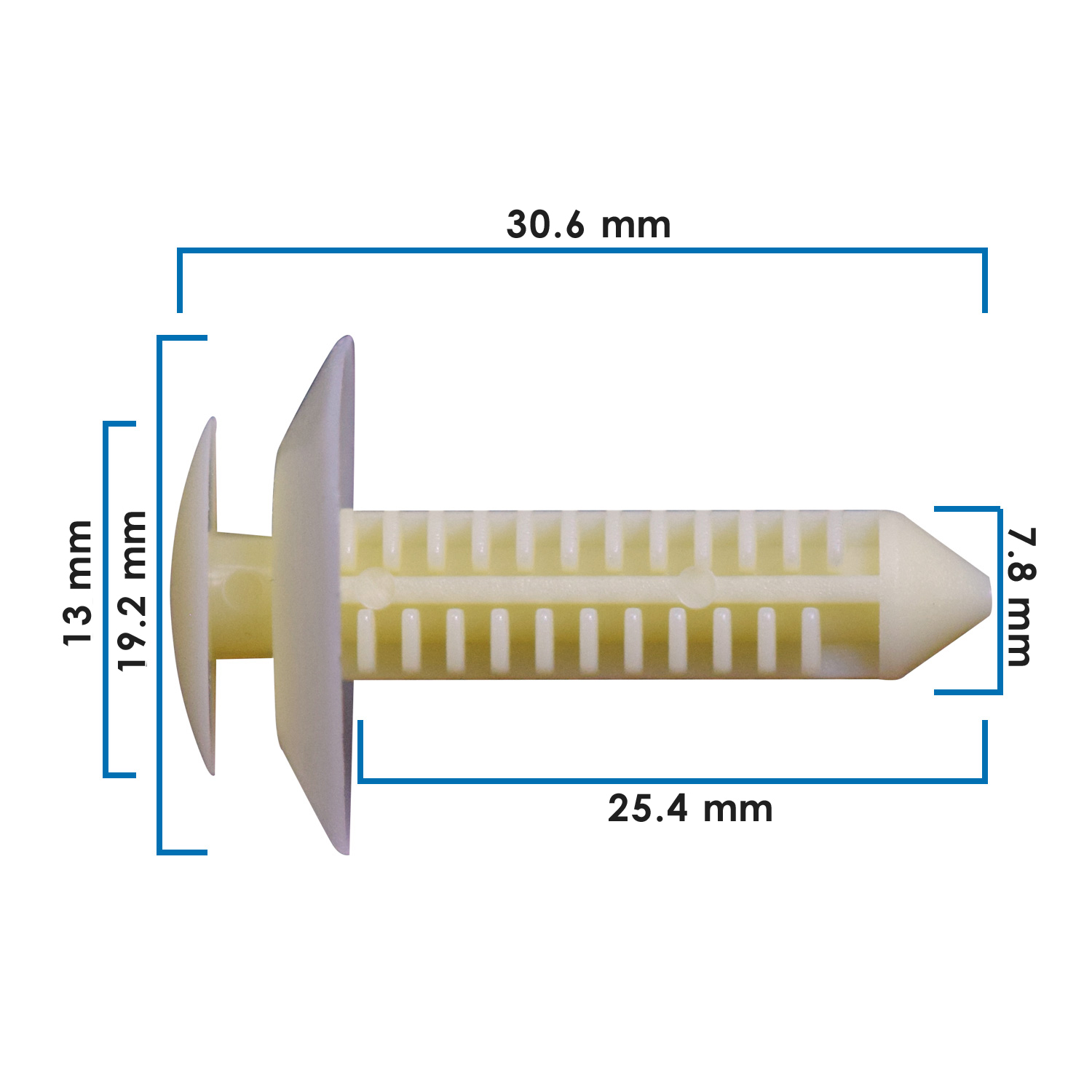 Pija larga de tapicería en nylon blanco para Ford, ideal para asegurar paneles interiores, techos y molduras con firmeza. Compatible con una amplia gama de modelos Ford de los años 80–90, ofrece sujeción duradera y profesional.