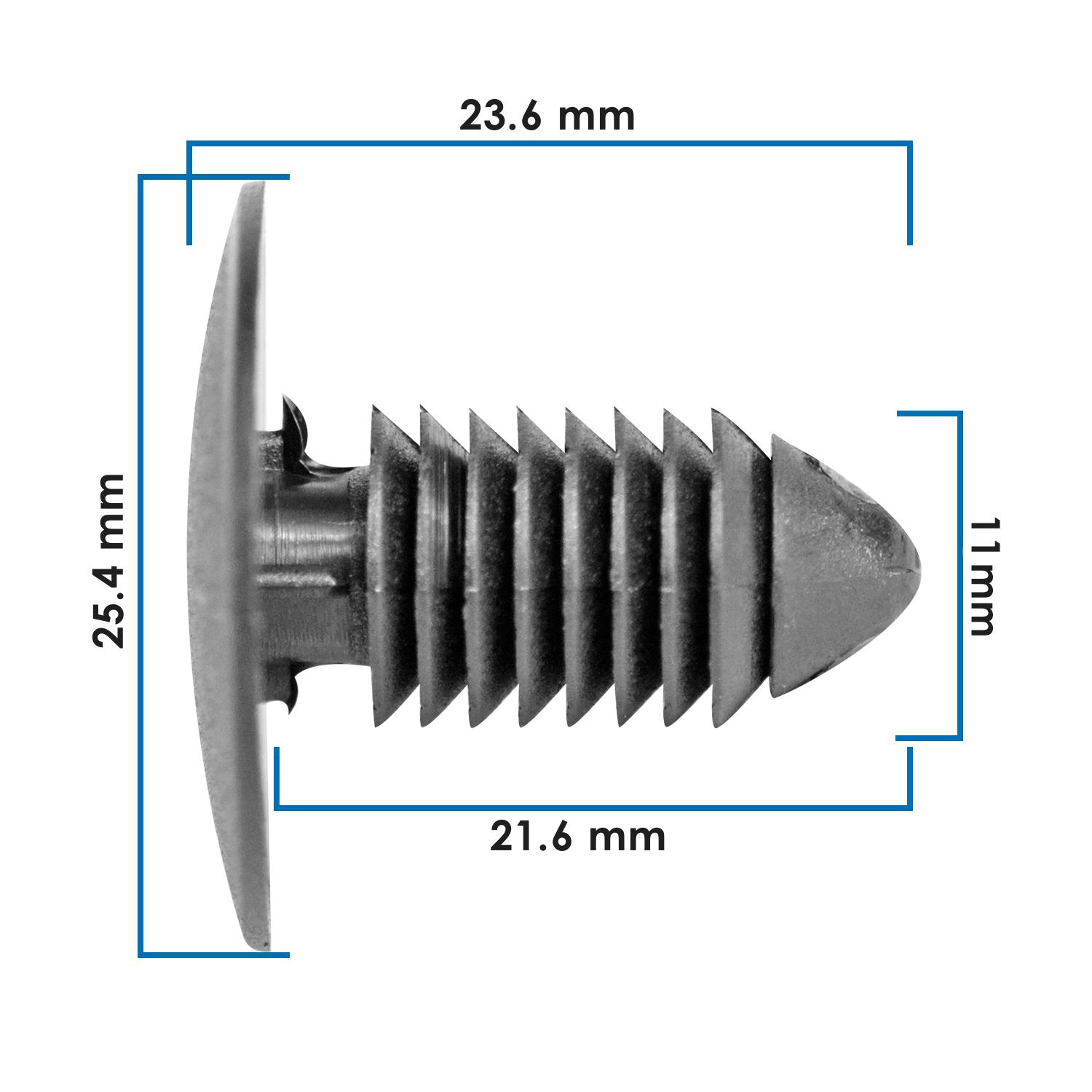 Pijas de tapicería universales en nylon negro, compatibles con vehículos como Buick Regal (1989–1996), Cadillac CTS (2003–2007), Chevrolet Impala (2000–2005), Ford Ranger (1998–2004), entre otros. Perfectas para fijar paneles, molduras y forros con ajuste firme y duradero.
